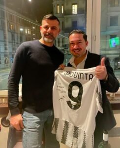 Sicuramente ho fatto felice i fan del calcio italiano e gli juventini con Vincenzo Iaquinta, ex calciatore e campione del mondo 2006 che ho portato all’evento Arosa Ice Snow Football; ma la mia più grande soddisfazione personale è stata portare come solo organizzatore, l’unico campione del mondo del torneo, stupendo e rendendo felici anche gli altri organizzatori dell’evento. Il giorno prima dell’evento, ad Arosa ho portato Vincenzo Iaquinta alla Fifa, che in quanto campione del mondo ancora non c’era stato per mettere la spilla sulla bacheca e firmare con dedica l’albo d’oro della Fifa. In quell’occasione Iaquinta ha donato una sua maglietta firmata e con dedica che è stata messa all’asta per una scuola calcio bambini di Arosa. La mia idea imprenditoriale è quella di portare in Svizzera sempre più giocatori e anche per questo sono stato il primo a portare una nuova idea insieme ai Gemelli di Milano, portando il trono e incoronando il miglior giocatore del giorno, Mladen Petric.